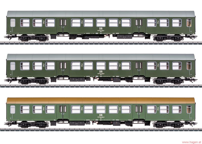 Modell: Komplette Neukonstruktion der Halberstädter Mitteleinstiegswagen. Mehrfarbige Inneneinrichtungen. Alle Wagen mit serienmäßig eingebauter LED-Innenbeleuchtung. In jedem Wagen ist ein Pufferkondensator zur Überbrückung von kurzfristigen stromlosen Stellen eingebaut. Alle Wagen mit serienmäßig eingebauter Zugschlussbeleuchtung, diese ist ab Werk bei einem Wagen eingeschaltet. Ausgestattet mit trennbaren, stromführenden Kurzkupplungen. Die Innenbeleuchtung funktioniert im Verbund mit dem Schlusslichtwagen, die vorgegebene Fahrzeugreihenfolge ist dafür einzuhalten. Typspezifisch gestaltete Drehgestelle, Dachformen, Seitenwände und Unterböden mit vielen angesetzten Details. Pufferhöhe nach NEM. Bremsschläuche, Heizleitungen und Schraubenkupplungen liegen als separat ansteckbare Teile bei. Befahrbarer Mindestradius 360 mm. Alle Wagen einzeln verpackt in zusätzlicher Umverpackung. Länge über Puffer ca. 84,6 cm.