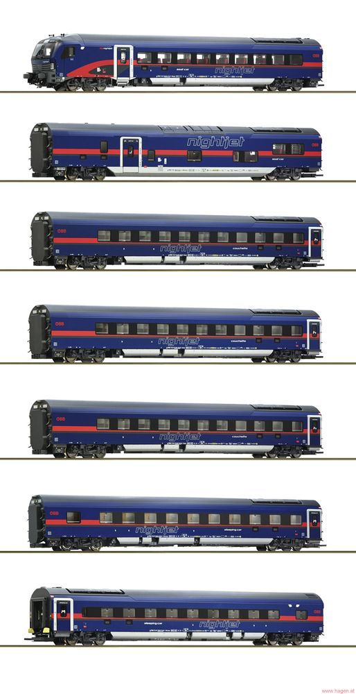 7-teiliges Nightjet-Wagenset der Österreichischen Bundesbahnen.