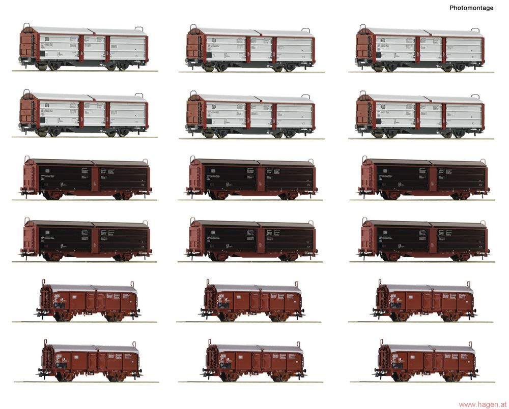 Modell: Display: Rangierbahnhof/Schiebedach-/Schiebewandwagen 18-tlg. Display in Epoche 4